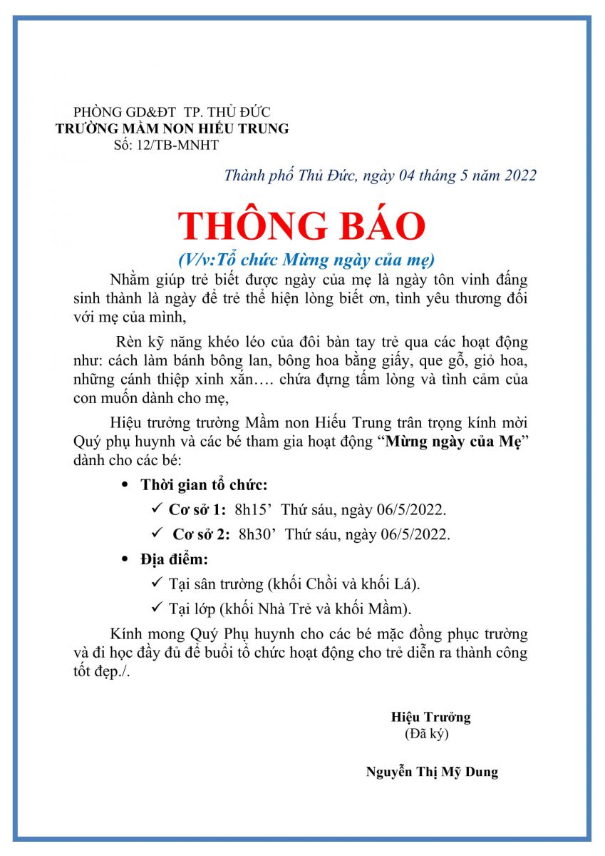 THÔNG BÁO VỀ VIỆC TỔ CHỨC NGÀY CỦA MẸ CHO CÁC BÉ