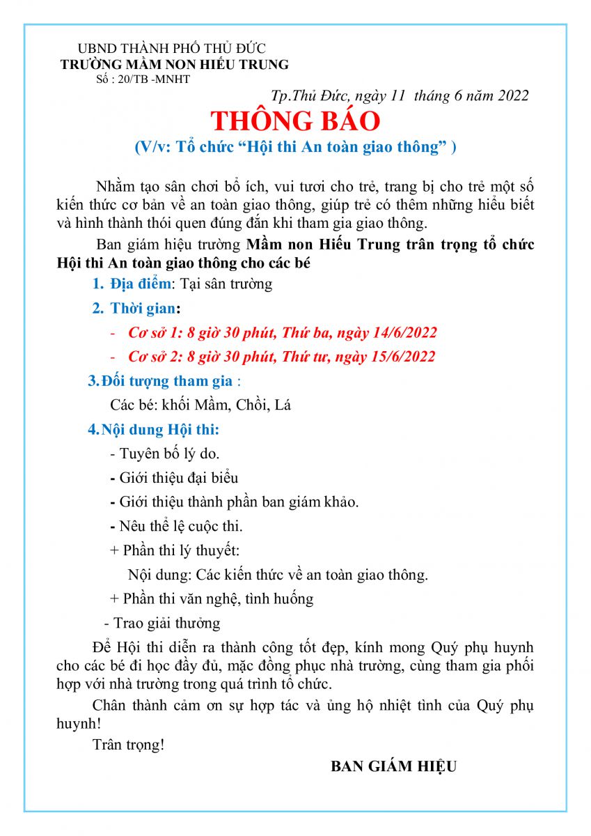 THÔNG BÁO HỘI THI : BÉ VỚI AN TOÀN GIAO THÔNG
