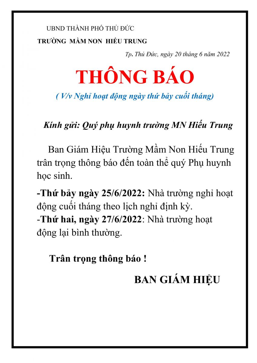 THÔNG BÁO NGHỈ HOẠT ĐỘNG THỨ BẢY CUỐI THÁNG