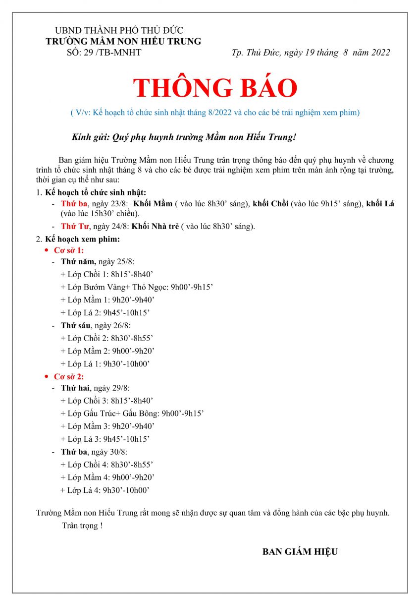 THÔNG BÁO XEM PHIM VÀ TỔ CHỨC SINH NHẬT THÁNG 8 CHO CÁC BÉ