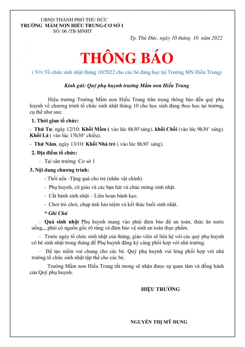 CƠ SỞ 1- THÔNG BÁO TỔ CHỨC SINH NHẬT CÁC BÉ THÁNG 10