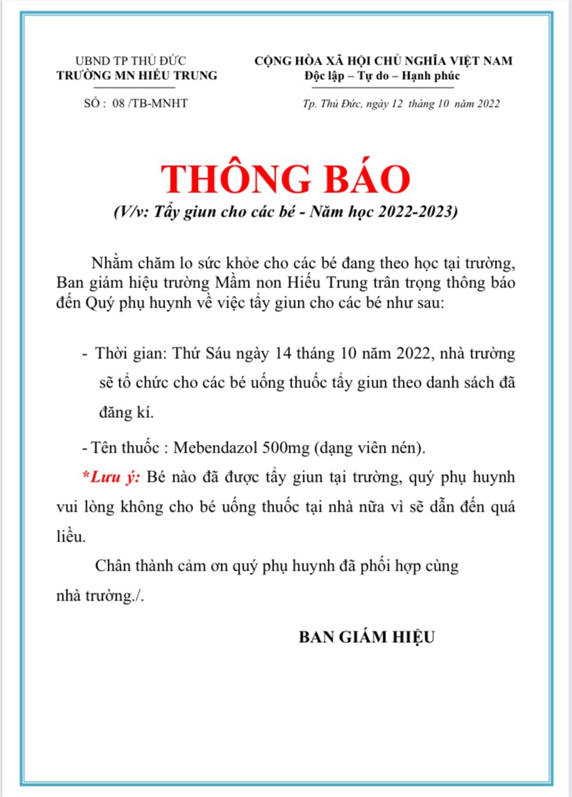 THÔNG BÁO TẨY GIUN CHO CÁC BÉ NĂM HỌC 2022-2023