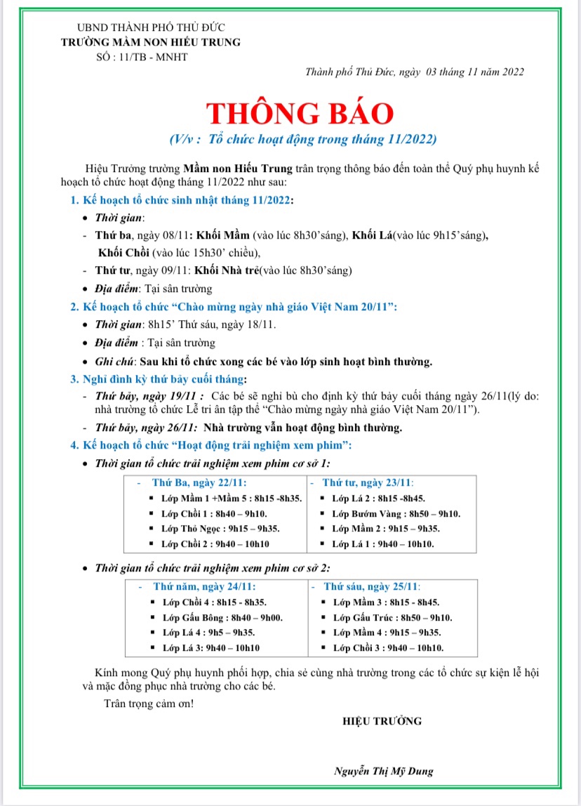 THÔNG BÁO KẾ HOẠCH TỔ CHỨC CÁC HOẠT ĐỘNG TRONG THÁNG 11/2022