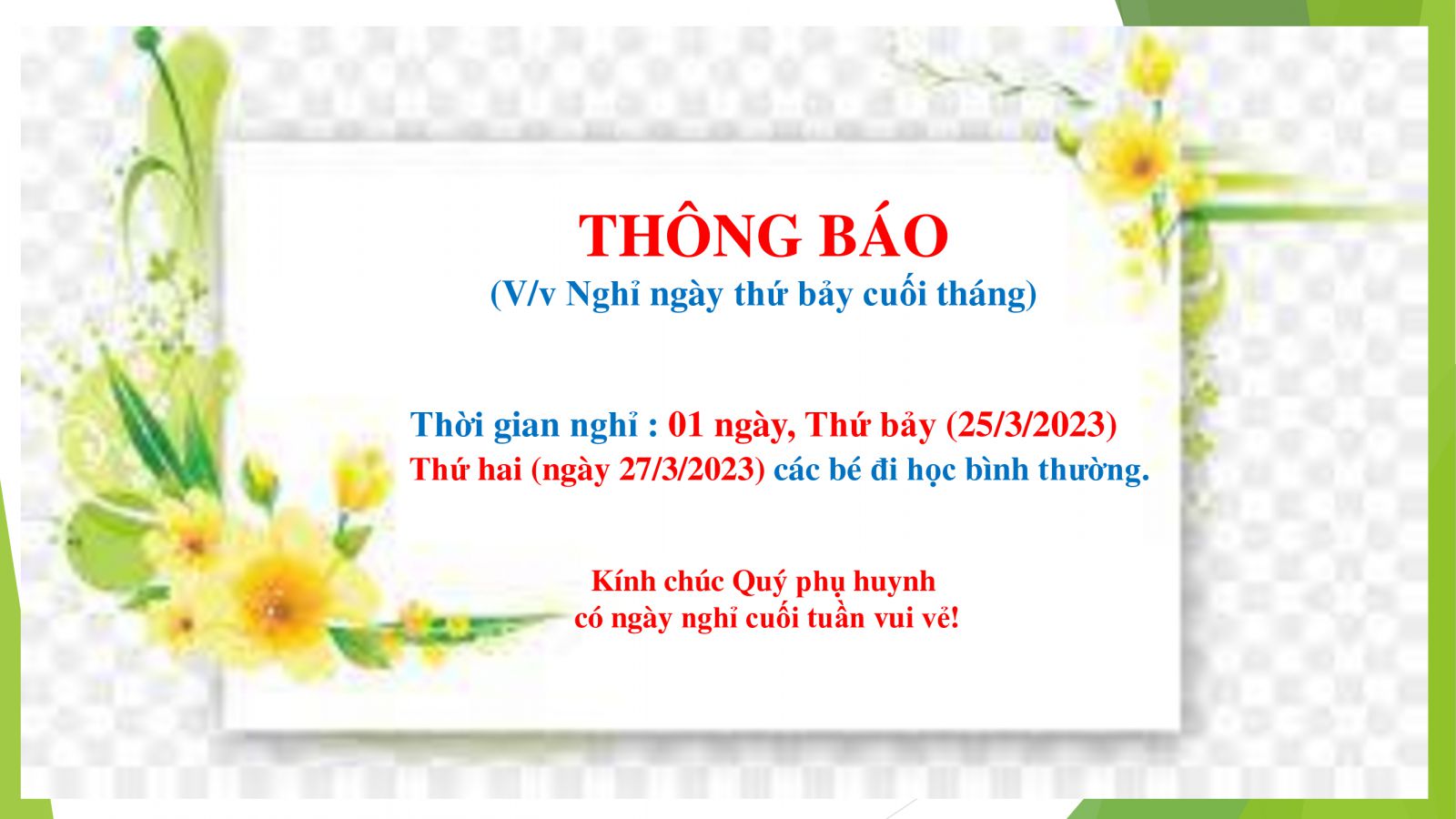 THÔNG BÁO NGHỈ THỨ 7 CUÔI THÁNG