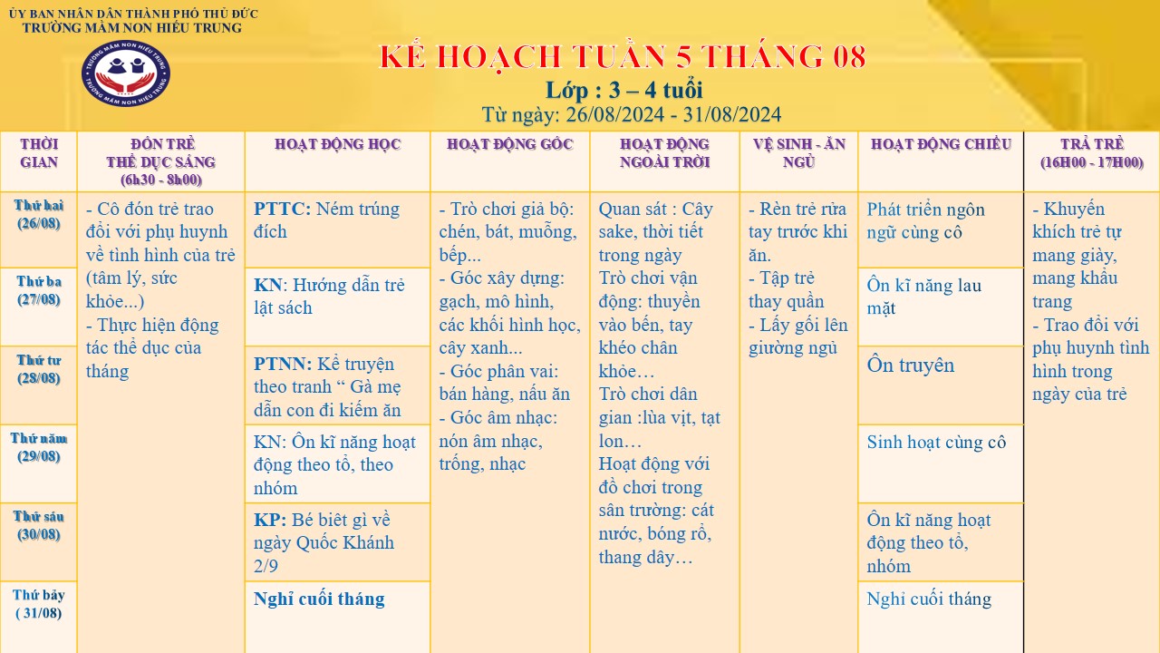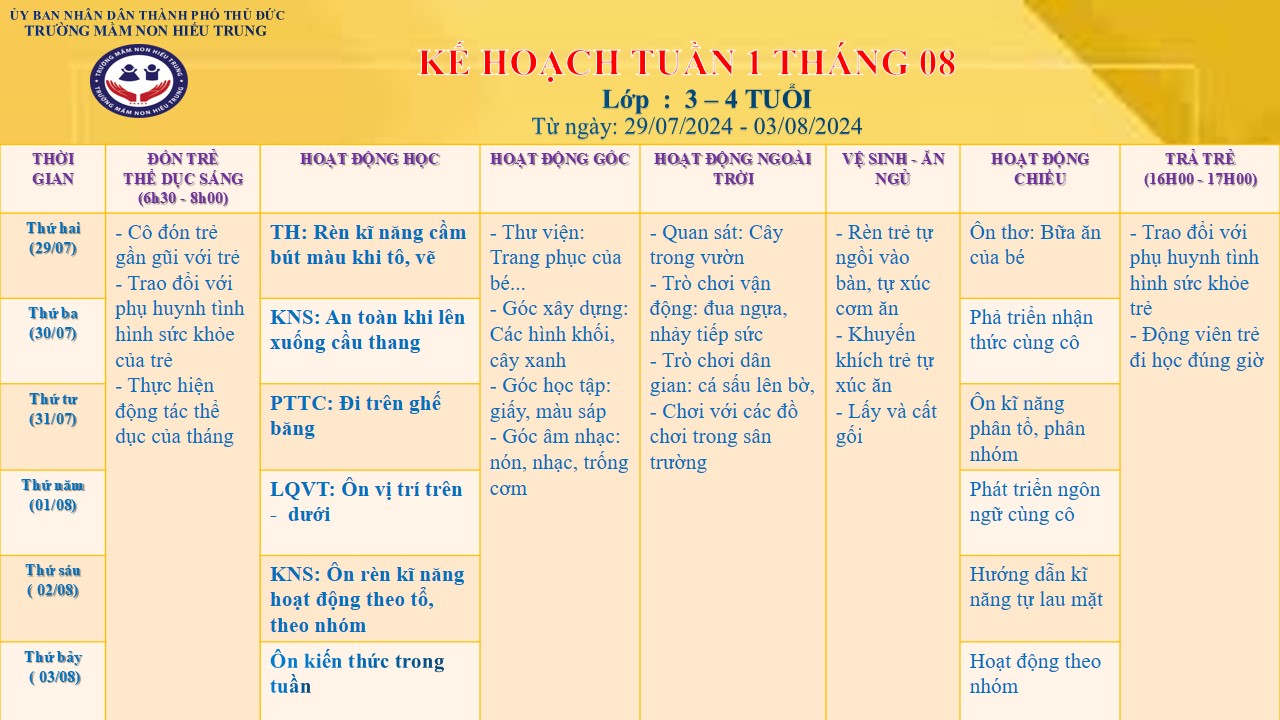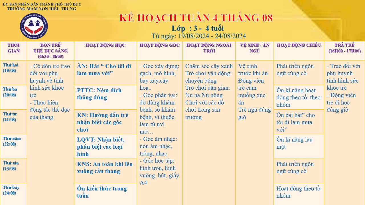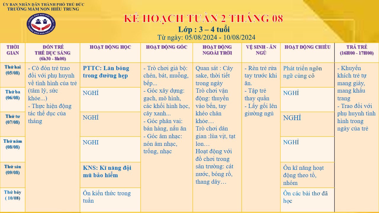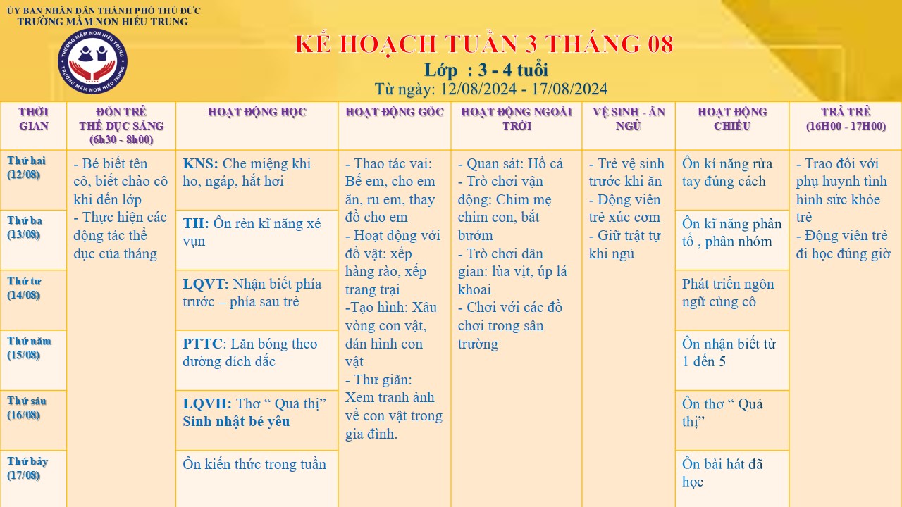 KẾ HOẠCH TUẦN THÁNG 08 - ĐỘ TUỔI: 3 - 4 TUỔI