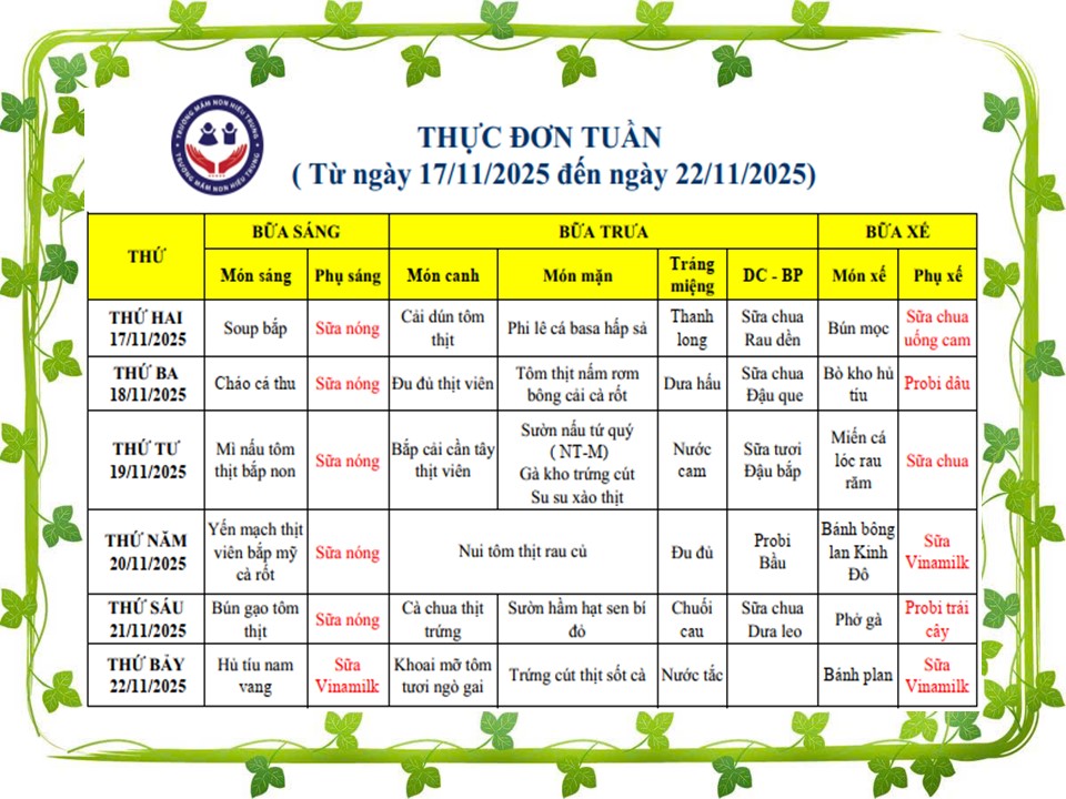 Thực đơn tuần từ ngày 17/11/2025 đến ngày 22/11/2025