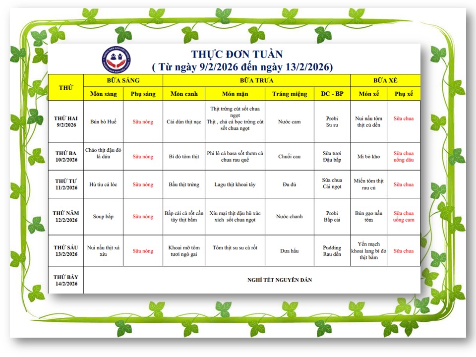 THỰC ĐƠN TRẺ TỪ NGÀY 09/2/2026 ĐẾN NGÀY 14/2/2026