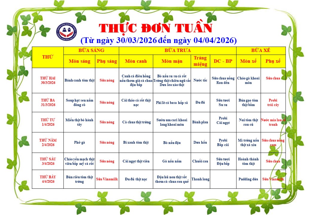THỰC ĐƠN TRẺ TỪ NGÀY30/03/2026 ĐẾN NGÀY 04/04/2026